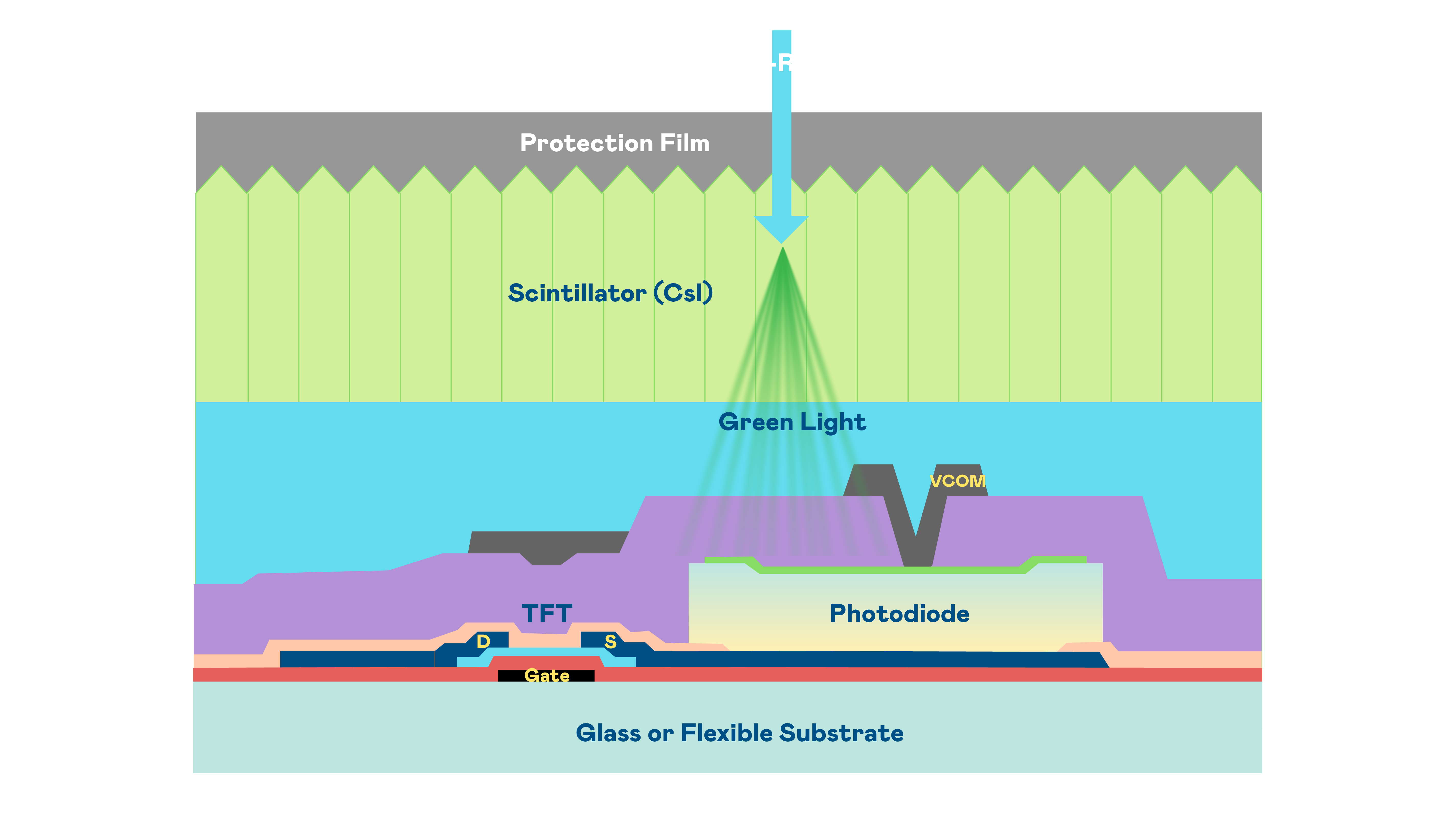 九洲国际的X光影像感测阵列使用薄膜电晶体 (TFT) 作为每个像素的读取开关,搭配光电二极体(Photodiode)的光电转换元件,用以感测X光影像讯号。